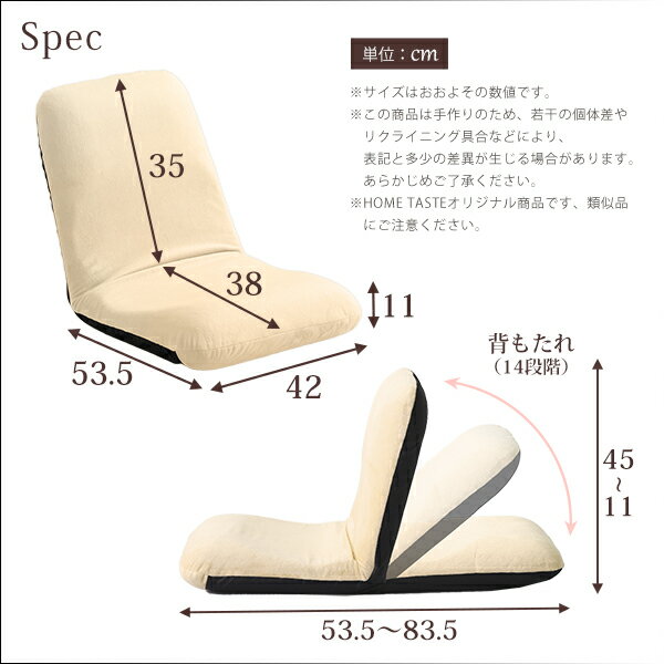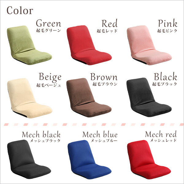 【商品について】美姿勢習慣、コンパクトなリクライニング座椅子(Mサイズ)日本製 | Leraar-リーラー-■サイズ:外寸:(約)幅42x奥行き53.5〜83.5x高さ11〜45cm(座面高:11cm)※商品重量:(約)3kg■カラー:起毛タイプ:グリーン、レッド、ピンク、ベージュ、ブラウン、ブラックメッシュタイプ:ブラック、ブルー、レッド■素材:表地:ポリエステル構造部材:スチールパイプクッション材:ウレタンフォーム■その他:・完成品でのお届けです。